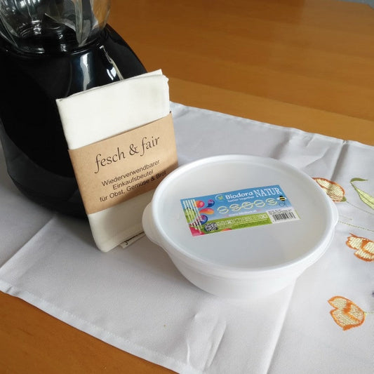 Bio Nussmilchbeutel aus Bio-Baumwolle & Biokunststoff-Schüssel