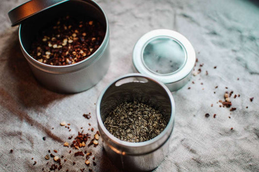 Dosen Set Gewürzaufbewahrung – Gewürzstreuer und Kräuterdose aus Weißblech